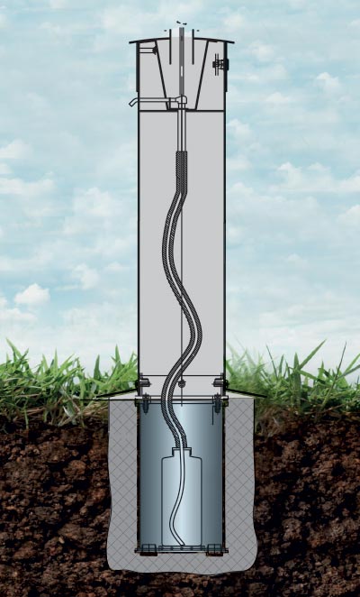 Grâce à notre principe de sécurité innovant, les bidons distributeurs et les pompes sont stockés dans des colonnes en acier inoxydable de haute qualité. Ainsi le désinfectant est protégé contre les intempéries.